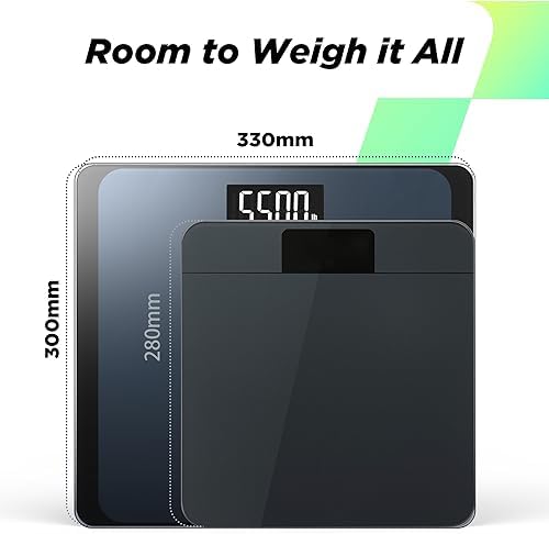 Room to Weigh it All This high capacity scale adopts an extra large platform (300 x 330mm) , providing enough room and comfort to accommodate you and your family, even allowing you to weigh with your child comfortably and securely