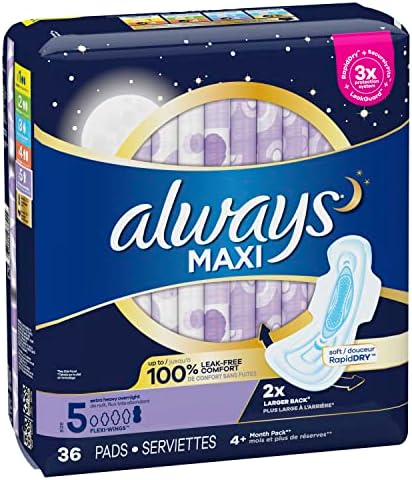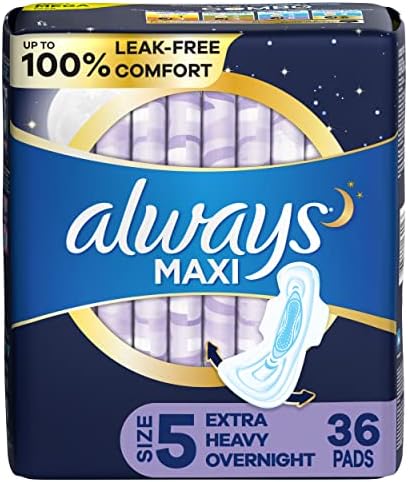 Rest easy with up to 100% leak-free comfort from the Always Maxi overnight pads. The pads feature advanced 3X Protection System to give you a worry-free night?s sleep, while RapidDRY works to wick away gushes in seconds. Plus, the pads? LeakGUARD core locks in leaks for long-lasting protection, while SecurelyFITS helps the pad stay in place throughout the night. Always Maxi Extra Heavy Extra Heavy Overnight Size 5 Pads Unscented with Wings feature a 2x larger back*, so you’re protected no matter how you sleep. Sleep tight with Always Maxi Pads. Are you getting the right protection from your pad? Did you know that 60% of women are wearing the wrong size pad? Using the wrong pad size can lead to leaks. Step up in size to help stop leaks. Now you can find your fit with ALWAYS My Fit, a tailored sizing system to help you find the best protection based on both your flow AND panty size. Use the sizing chart in the images to find your fit for day and night. For our best nighttime protection, ALWAYS Maxi, Size 5, Extra Heavy Overnight Pads With Flexi-Wings have a 2X larger back to help stop leaks at night,* plus a LeakGuard Core that absorbs in seconds and gives you up to 10 hours of protection. *vs. ALWAYS Maxi Regular With Wings