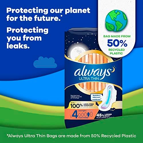 Think all feminine hygiene pads are the same? Think again! Always Ultra Thin Overnight Pads with Flexi-Wings are our best yet, providing people with periods up to 100% Leak-Free Comfort. Always Ultra Thin Overnight Pads with Flexi-Wings have a flexible sanitary pad design that moves with you. Plus, Ultra Thin Pads have Always 3x Protection System™ to give you peace of mind day and night. RapidDRY™ absorbs gushes 90% faster than the leading store brand. The LeakGUARD™ core locks in leaks for long-lasting protection. Plus, OdorLOCK™ helps prevent unwanted odors to help you feel fresh and clean throughout your day! Did you know that 50% of people with periods are wearing the wrong size pad? Do not sacrifice your sleep during your period, instead, wear a larger size pad at night to catch your period flow when you are laying down. Always Ultra Thin Overnight Pads have 45% more back coverage than our size 1 pad, so you can rest easy. All our Ultra Thin feminine hygiene pads have our 3x Protection System™ and come in a range of period pad sizes from 1 to 5 to fit your flow and size perfectly. If you have a light flow or need a teen-sized pad, then we would recommend using our Always Ultra Thin size 1 to 3. If you have a heavy flow or want overnight protection, then use our size 4 or 5 Ultra Thin Pad. Always Ultra Thin has you protected day and night from your first period to your last. Remember that all Always Ultra Thin Pads are FSA eligible! Check with your FSA or HSA plan provider for information on the coverage of period care products.