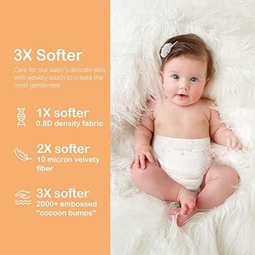 🤗 【45% Cut of Friction】The innovative embossed cocoon pattern on the top sheet cut 45% of skin contact, which also means 45% decrease of friction. Dry diapers do not only bring a fresher feel to baby’s skin, but also gently touch baby’s tushy on their each move.