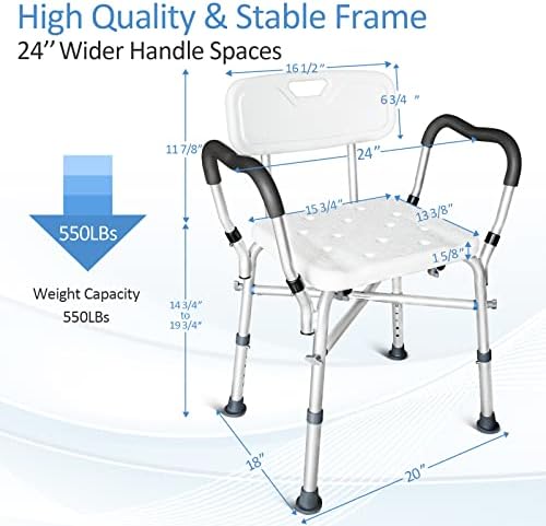 [Durable, Reliable, Heavy Duty] – KingPavonini shower chairs with arms are made with premium aluminum alloy frames. This sturdy shower chair comes with a reinforced crossing bar and back support for extra strength up to 550LBs,is one of the best shower chair for Elderly, Adults, Disabled or people recover from surgery.