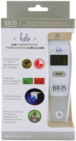 The “HALO” is a unique ear thermometer, offering users the ultimate in convenience with fast measurements. The probe in the Halo, 1 Second Ear Thermometer illuminates, making measurements in the dark wonderfully easy. “Clean Me” technology eliminates the need for probe covers and indicates when the lens needs cleaning. This digital ear thermometer is intended to measure the human body’s temperature in regular mode, within the ear canal from energy radiated from the eardrum and the surrounding tissue. This device was designed to be reusable for clinical or home use, on people over two years of age.