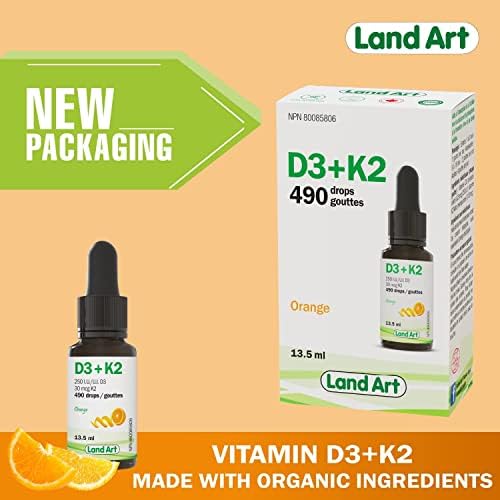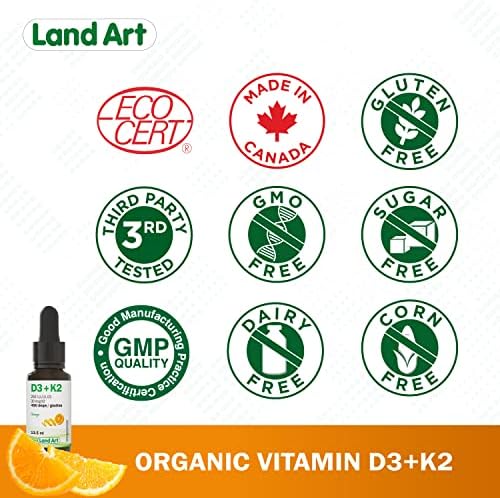 Land Art’s Certified Organic Vitamin D3+K2 is gluten free, vegetarian and preservative free! Our Vitamin D3+K2 drops are made with naturally sourced D3 vitamin derived from lanolin and natural vitamin K2-MK7 sourced from Natto. The D3+K2 vitamin is mixed with organic sunflower seed oil. Our D3+K2 vitamin product comes with a dropper to facilitate dosage. One drop contains 250 IU of vitamin D3 and 30 mcg of vitamin K2-MK7. Each bottle contains 490 drops.