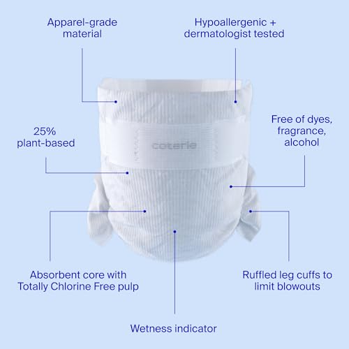 THE BABY DIAPERS: Minimize leaks, blowouts, and the likelihood of diaper rash with up to 70% more liquid capacity*, up to 4x faster absorbency*, and up to 3x drier skin*. Coterie diapers for newborns are made with 25% plant-based, ultra-soft, apparel-grade materials. (*Compared to leading brands in lab testing).