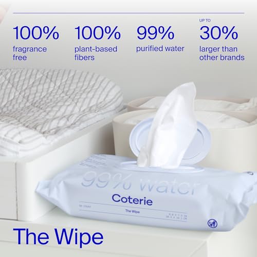 THE BABY WIPES: Coterie newborn wipes are made with 99% water and 100% plant-based fibers. Each wipe is up to 30% larger*, ultra-soft, and gentle on sensitive skin. (*Compared to leading brands in lab testing).