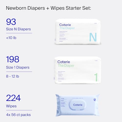THE NEWBORN DIAPER + WIPE KIT: This baby must haves bundle contains 291 diapers [93 SIZE NEWBORN diapers (<10 lbs) + 198 SIZE 1 diapers (8-12 lbs)] and 224 wipes [(4) 56 count packs] - Diaper packaging may vary, product is the same.