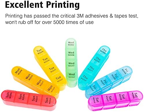 Excellent Printing – Bold letter marks on the daily pill organizer will remind you what to take by the day. The printing of the medicine organizer have passed the critical 3M adhesives & tapes test, won’t rub off for over 5000 times of use