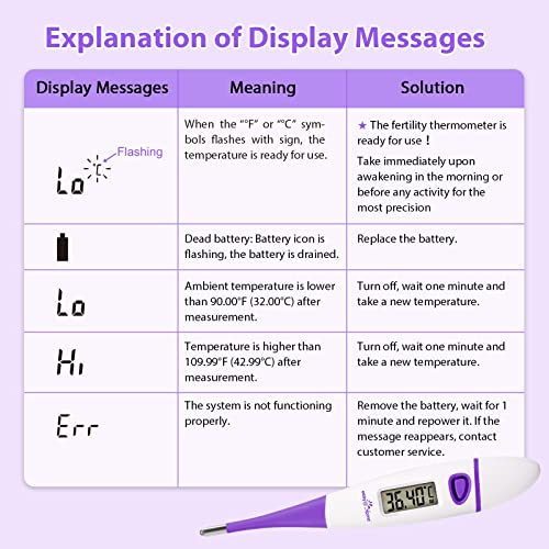 💕How to Use Digital Ovulation Thermometer: Please place the BBT thermometer under your tongue. For the most accurate result, take it right before you wake up in the morning or before doing any activities.When””℉”” or “”℃”” starts flashing with “”Lo”” on display, the fertility thermometer is then ready to use. The digital BBT only takes around 1 min to read the results. NOTE: “”Lo”” does not mean the battery low!