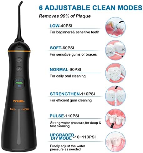 【6 CLEANING MODES & UPGRADED DIY MODE】: For different oral problems, travel water flosser for teeth offer 6 clean modes: LOW-40PSI, SOFT-60PSI, NORMAL-90PSI, STRENGTHEN-110PSI, PULSE-110PSI and UPGRADED DIY Mode-10~110PSI for your different oral care needs. Dental water flosser has NEW DIY mode, you can choose the most comfortable water pressure (10-110PSI) from low to high 8 gears. DIY mode design allows you to customize your own teeth cleaning experience
