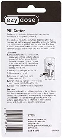 Ezy Dose Tablet Splitter – Pill Cutter – This Pill Splitter is Simple To Use and Easily Cuts Through Tablets and Pills This Pill Cutter has a simple design that is easy to use. It’s stainless steel blade effortlessly cuts through pills and tablets The main features of the Pill Cutter include: Compact Design – Compact Design allows for discrete storage and easy transportation. Stainless Steel Blade – Stainless Steel Blade is durable and easily cuts through pills and tablets. Simple Cutting Action – Cuts and Splits medication efficiently with only light pressure applied by the user. About Ezy Dose: Ezy Dose is the leader in easy-to-use medication management products. Many of our push-button pill planners are endorsed by the Arthritis Foundation for our ease-of-use design. Ezy Dose products make living healthier simply easier with products like pill cutters, pill crushers and a full line of easy-fill planners.