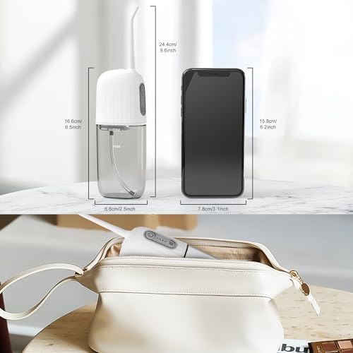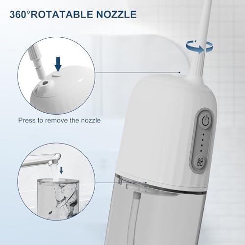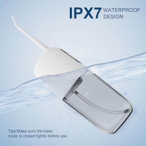 【200ML capacity & IPX7 Waterproof】Our water tank has a capacity of 200ML, and you can also place the nozzle in the tank, which is very convenient. At the same time, our dental flosser has IPX7 waterproof, BUT please be careful not to put the charging port into the water.