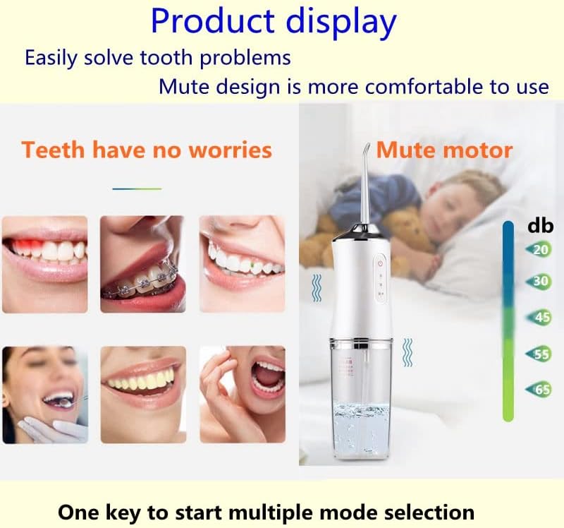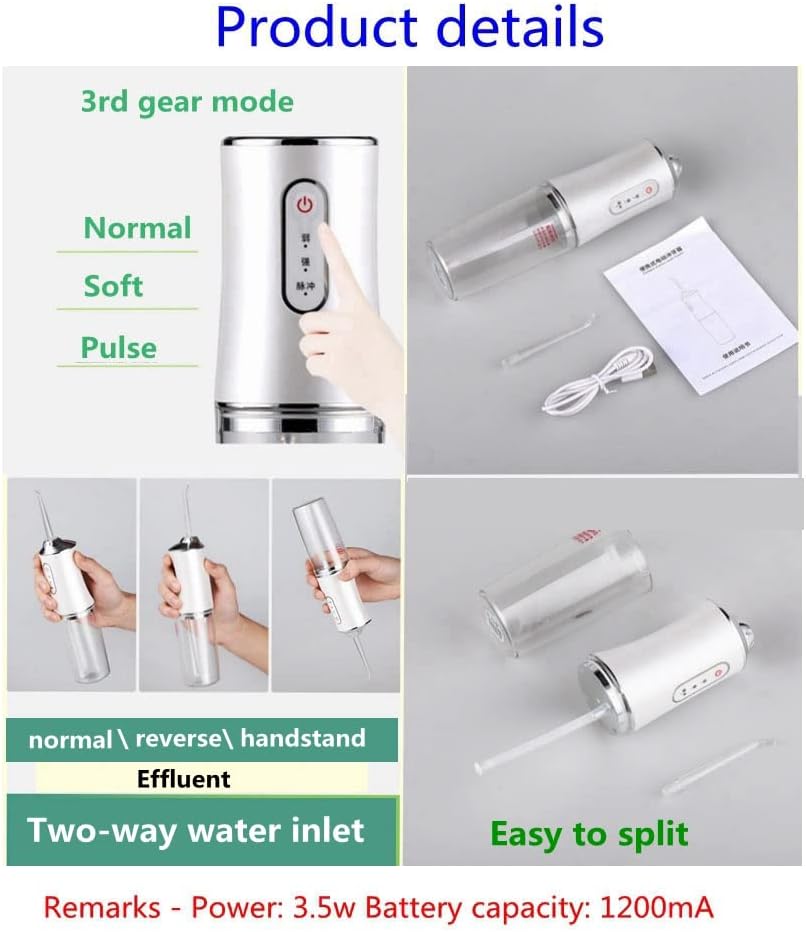 Product name: tooth cleaner Product color: white pink Product material: ABS Product weight: 0.3kg Package size: 25 * 12 * 6.5cm 10 * 4.8 * 2.6in Package list: tooth washer * 1 nozzle * 4 Tips: About color difference: All the goods in our shop are taken in kind. Due to the sun, angle, display and other reasons, there may be some color difference between the picture and the goods, which shall prevail About size: due to manual measurement, slight measurement deviation is allowed, and the error is about 1-2cm/0.3-0.6in