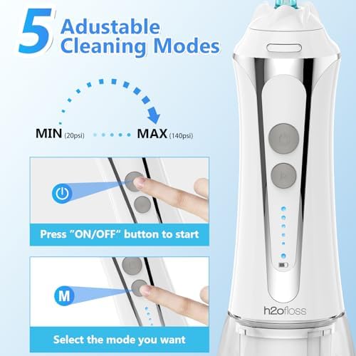 【Advanced Water Flosser with Gravity Ball Patent】Upgraded with 5 settings of water pressure from 40psi to 140psi. More water pressure options for custom clean needs. Innovative Gravity Ball design keeps flossing in any angle to ensure thoroughly cleaning.