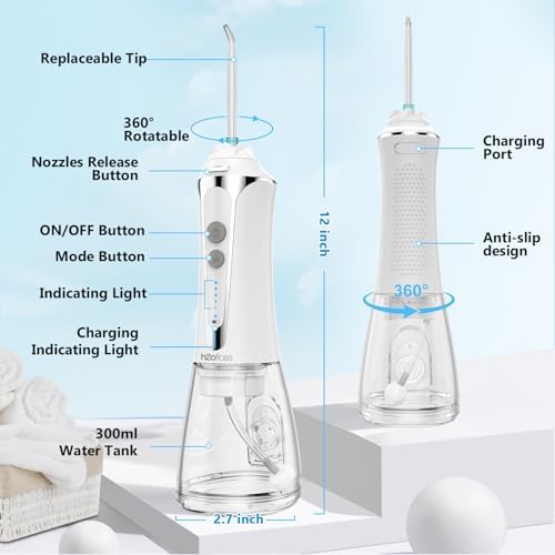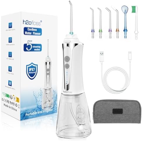 【360°Rotatable Nozzles & IPX7 Waterproof】6 multifunctional jet nozzles can effectively solve brace, orthodontics, dental plaque, bad breath problem . IPX7 and double-sealing rings design makes h2ofloss dental Flosser be safely used for shower.