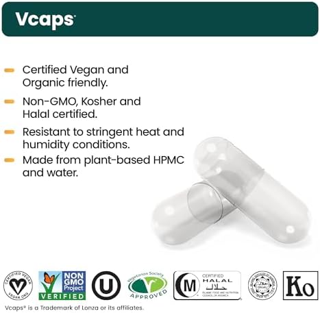 Vcaps are made of just two components: plant-based HPMC and water. They are a globally acceptable primary vegetarian capsule, and in Europe, they are suitable for use with organic ingredients. They are Non-GMO, Kosher and Halal certified.