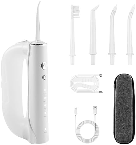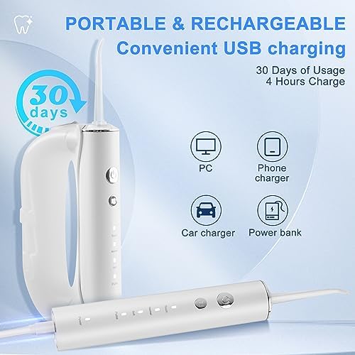 【Powerful Battery &T IPX7 Waterproof】Water Dental Flosser Cordless for Teeth with powerful and environmental battery, fully charged need 4 hours and used continuously for about 30 days. Come with USB Cable, applicable to a variety of charging equipements.With double-sealing rings, oral irrigator braces flossers prevent water leakage reliably, allows the dental flosser braces cleaner to be used safely for shower in bathroom.