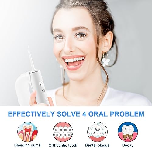 【Deeper Teeth Cleaning To Improve Gum Status】The water dental flosser equipped with 0.6mm ultra-fine double water column and high pressure water pulse function, it can powerful cleaning 99.99% food debris and plaque every corner precisely that traditional brushing can not reach.Oral irrigator can prevent teeth stain, bad breath and other oral problems.Specifically designed for periodontitis, braces.