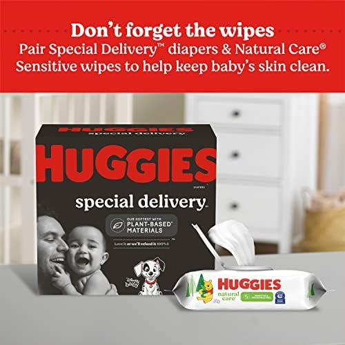 Deliver premium quality to your baby with Huggies Special Delivery Baby Diapers. Special Delivery Baby Diapers are our Softest Diapers Guaranteed*, love it or we’ll refund it 100%! Dermatologist-tested and clinically proven to be hypoallergenic, these disposable baby diapers are made with plant-based materials** (**20%+ by weight) for trusted performance. Special Delivery offers Huggies Trusted Protection with responsibly-sourced materials.*** Not only are these super soft diapers safe for sensitive skin, but they also do not contain harsh ingredients and are free of fragrances, lotions, parabens, and elemental chlorine bleach. These baby diapers are crafted with a contoured shape, soft flexible leg cuffs and a back pocketed waistband to help prevent diaper blowouts and contain the mess. They absorb wetness and lock away moisture to keep your baby’s skin clean and healthy, while a 100% breathable outer cover ensures airflow. Plus, with a wetness indicator, you’ll always know when your little one is ready for a diaper change! For our perfect pair that’s inspired your perfect care, try Huggies Natural Care Sensitive Baby Wipes. Huggies Special Delivery Diapers feature adorable 101 Dalmatians designs and are available in size Newborn (up to 10 lbs), size 1 (up to 14 lbs), size 2 (12-18 lbs), size 3 (16-28 lbs), size 4 (22-37 lbs), size 5 (27+ lbs), and size 6 (35+ lbs). Don’t get caught without Huggies diapers! Sign up for Subscribe & Save to ensure you always have Special Delivery on hand. Join Huggies Rewards+ powered by Fetch to get rewarded. Earn points on Huggies products redeemable for hundreds of gift cards. Download the Fetch Rewards app to get started today! (*Mail in within 30 days of purchase date. Online access required. Limit 1 per household. Original receipt/UPC required. Restrictions apply. See Huggies website for details and submission form. Expires 12/31/23.) (***Forest Stewardship Council certified pulp)