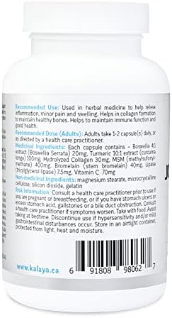 Designed by medical professionals to help relieve inflammation, minor pain and swelling. Kalaya joint and muscle supplements promote joint mobility and support overall joint health by maintaining healthy bones, immune function and good health. Formulated with 7x health Canada approved natural active anti-inflammatory and pain-relieving ingredients including; Boswellia, turmeric collagen, MSM, bromelain, lipase and vitamin c.