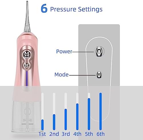 【6 Flossing Model Oral Irrigator】6 adjustable modes (6 different cool light bar distinctions) to suit all different conditions of teeth and gums.With 6 replacement nozzles can be used by different family members:4*standard nozzles for daily teeth cleaning(different colored rings make it easy to distinguish between diferent family members).Additional with 1*orthodontic nozzle and 1*tongue nozzle,for cleaning braces,bridge and residue;clean tongue coating.