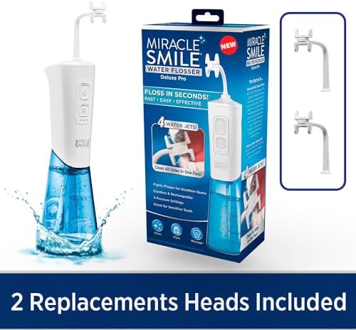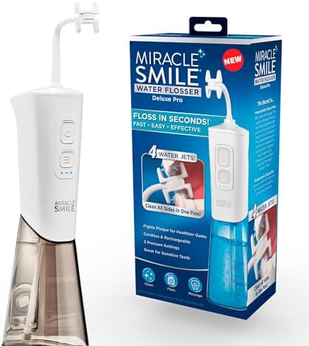 Miracle Smile, the revolutionary new water flosser that helps floss your entire mouth in seconds for a cleaner feeling mouth and a brighter looking smile. The patent-pending “H-Shaped” flossing head with 4 targeted water jets surrounds each tooth to help rinse the top, bottom, front, and back teeth and below your gumline, all at the same time, in just 10 seconds.