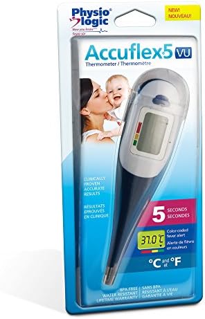 Physio Logic Accuflex 5VU Digital Thermometers provide clinically proven accuracy for temperature readings you can trust. In less than 5 seconds, this digital thermometer provides results on a large back lit screen in either Fahrenheit or Celsius. The Accuflex 5VU Thermometer features a flexible tip, is accurate within 0.2 degrees F/0.1 degrees C and beeps when peak temperature has been reached. In addition, the Color Feverline alert indicates if the reading is normal or if it represents a mild or high fever. This digital thermometer also has a handy memory recall that will display your last reading and is waterproof and washable for convenience and hygiene. The Physio Logic Accuflex 5VU Digital Thermometer includes auto shut-off for extended battery life. Package includes 1 digital thermometer, battery and illustrated instructions. Model # 016-651
