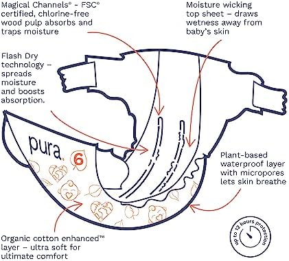 GOOD FOR THE PLANET: Pura’s EU EcoLabel accredited diapers are manufactured in a carbon neutral plant, powered by green electricity. Where possible, we’ve replaced non-sustainable materials with lower impact materials such as wood pulp from sustainably managed forests in the absorbent core of our diapers. Our packaging is made from paper, so it’s easier to recycle!