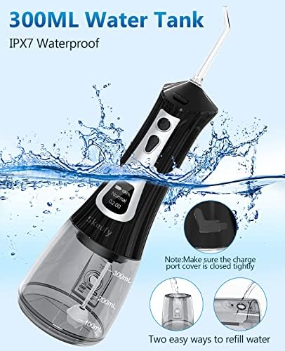 300ML Water Tank & IPX7 Waterproof: The 300ML water tank can hold sufficient water for about 60~90 seconds of continuous flossing. IPX7 waterproof design is adopted in both internal and external to provide dual protection. ( please remember to close the charge port tightly when using )