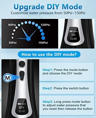 DIY Mode and Smart LED Display : The water flosser not only has the basic 5 cleaning modes, but also adds an upgraded DIY mode, which can freely customize the water pressure from 50~150Psi set your favorite mode. The unique LED display will show the usage mode, working time and power. ( recommend choosing a child or soft mode for the first use )