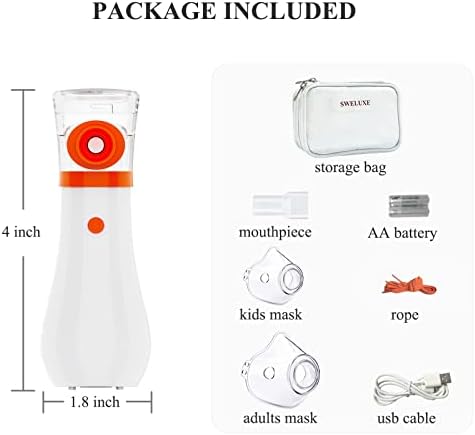 Package included: 1 x nebulizer, 1 x mouthpiece, 1 x adults mask, 1 x kids mask, 2 x AA batteries, 1 storage bag