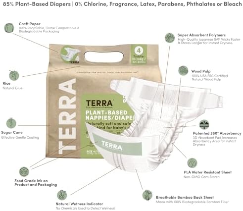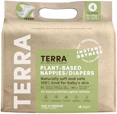 ECO DIAPERS THAT WORK: Gentle on your baby and their world—and they work. Made with 85 percent plant-based materials and a featherlike ultra-soft top sheet, Terra diapers are suitable for all skin types and dermatologically rated ‘Excellent’ by Dermatest.