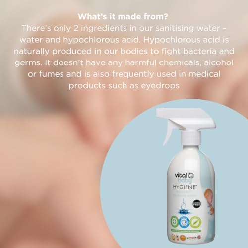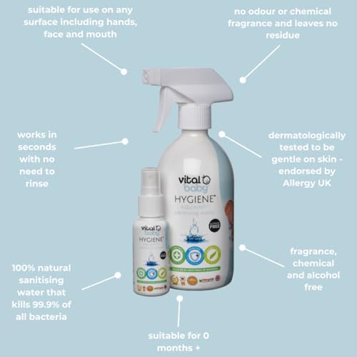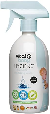 Key features – Suitable for 0+ months. Kills 99.9% of germs in seconds. Fragrance and alcohol free. Endorsed by Allergy UK. 100% natural cleansing water. 1 x 500ml Bottle of Vital Baby™ AQUAINT® Sanitising Water.