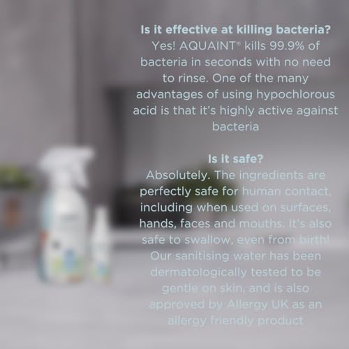 AQUAINT® Sanitising Water is a revolutionary 100% NATURAL cleansing water that kills 99.9% of bacteria in seconds. Simply spray onto any surface (even if it is going into the mouth) and it is sanitised! There is no need to rinse or wipe, and it can be used on any surface and even on baby’s skin.