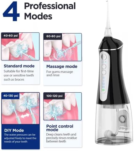 【Upgraded 4 Flossing Modes】 4 professional water stream settings (Stand, Massage, Point Contorl and DIY Mode), and the adjustable psi from 40-130, Grinest water Dental flossers can Easily remove food residue hidden deep for teeth , Make your teeth cleaner.