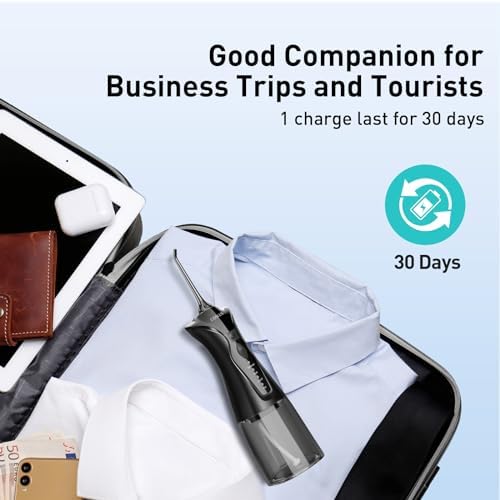 30 Days Extended Battery Life for On-the-Go Use: The portable water dental flosser features a powerful eco-friendly battery that lasts double the time of other models. With just 3 hours of charging, you can enjoy up to 30 days of use. Its compact and lightweight design makes it perfect for use at home or on-the-go, and it comes with a USB cable (adapter not included) for easy charging