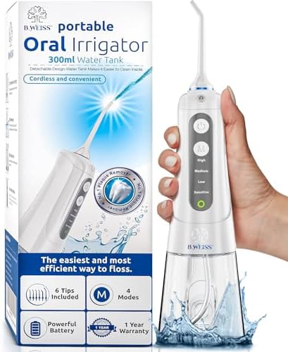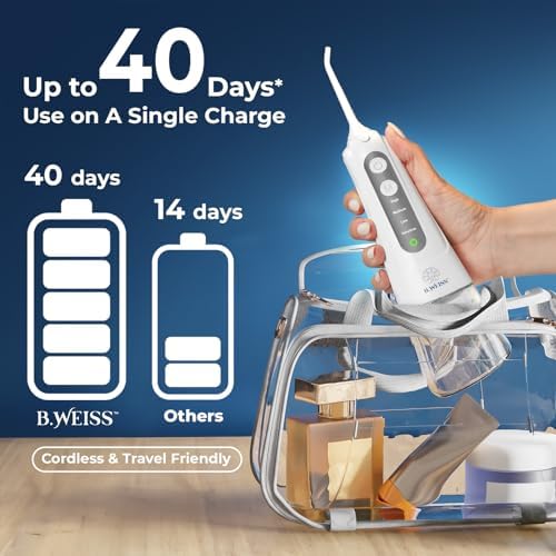 Up to 40 Days of Use No longer endure the mess and hassle of traditional string flossing. With the B. WEISS water flosser cordless design, you only need to charge the flosser once a month to enjoy uninterrupted use. The 10 Oz/300ML water tank capacity allows for a full mouth clean-up with just one refill, and the detachable water tank makes cleaning a breeze.