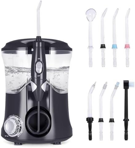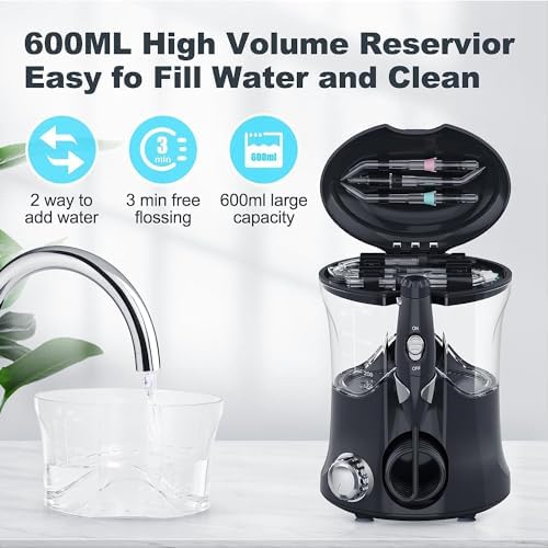 8 Nozzles for Whole Family Use – The water flossers for teeth comes with 3 normal high-pressure nozzles, 5 other special nozzles (1 tongue cleaner, 1 plaque head, 1 orthodontic head, 1 periodontal head, 1 toothbrush head). The different nozzles work deep and hygienically to remove plaque or food residue between teeth and gums that are difficult to brush or floss. The replaceable dental water jets store hygienically and conveniently in a separate recessed cover on top of the oral irrigator.