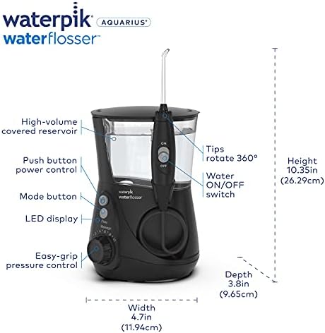 The Easy and More Effective Way to Floss, the Waterpik Aquarius Professional Water Flosser is the most advanced water flosser ever. Featuring a new compact and contemporary design, the Aquarius includes on/off water control on the handle, an LED information panel, and 7 water flosser tips. New pulse-modulation technology provides maximum plaque removal (Floss Mode) and enhanced gum stimulation and improved circulation (Hydro-Pulse Massage Mode). The convenient one-minute timer with a 30-second pacer ensures thorough water flossing of all areas.