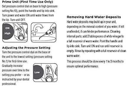 KEY FEATURES: 7 tips for multiple family members and needs, 10 pressure settings (10-100 PSI), removable 22 oz reservoir (top-rack dishwasher safe for easy cleaning), 90 secs of flossing time, 360 tip rotation, 120VAC/60Hz for use in North America only.