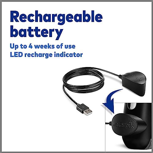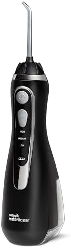 “ADVANCED HANDHELD CORDLESS WATER FLOSSER: Waterpik Cordless Advanced features a handheld design with quiet operation and a rechargeable battery. Convenient charger connects magnetically and charges in 4 hours; LED indicator lets you know when it’s time to recharge. GREAT FOR TRAVEL: Cordless Advanced is portable and global voltage compatible; it includes a micro-fiber travel bag, tip storage case, and water plug for use on the go. DENTIST RECOMMENDED: The #1 Dental Recommended Brand. Waterpik is clinically proven and the only Water Flosser to have earned the Canadian Dental Association (CDA) Seal of Validation. KEY FEATURES: 4 tips, 3 pressure settings (45-75 PSI), removable 7 oz reservoir (top-rack dishwasher safe for easy cleaning), 45 secs floss time, smart rechargeable NiMH battery, magnetic charger, global voltage, 360 tip rotation, travel bag, tip case, shower safe. EASY AND EFFECTIVE: The Waterpik Cordless Advanced water flosser removes up to 99.9 percent of plaque and is up to 50 percent more effective than dental floss for improving gum health. Just fill the reservoir with warm water, place the tip in your mouth, and start flossing.”