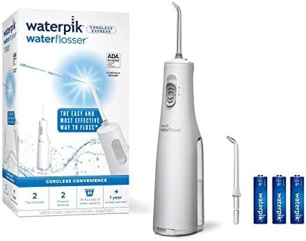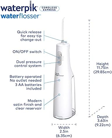 The Waterpik Cordless Express WF-02 is a great solution when you want the convenience of water flossing in the shower or on the go. It combines water pressure with pulsating action for an exceptional cleaning, removing plaque and debris that traditional brushing and flossing can’t reach. Waterpik Cordless Express water flosser is designed for travel anywhere, use in the shower, and smaller bathrooms. This cordless water flosser uses 3 AA batteries (included), so no charging cords and no outlets are required. It includes an easy-to-fill, removable 5-ounce water reservoir, 2 JT-450E water flossing tips, 2 pressure settings ranging from 45 to 75 PSI, and 1200 water pulses per minute. Cordless Express measures 2.5w x 3.6d x 11.75h (inches with tip).