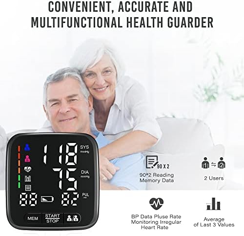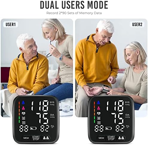 DUAL USER MODE and 90*2 READINGS MEMORY: The wrist BP machine supports 2 users data storage, each user for 90 sets(total 180 readings )of data memory. With the built-in storage function, this blood pressure monitors allows you to recall the most recent 180 historical readings that record your health status, the best gift for mom and dad.